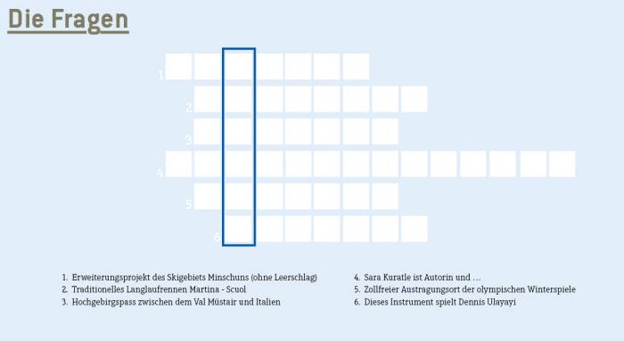 Teilnahmeberechtigt sind alle Einheimischen und Gäste (Ausnahme: ALLEGRA-Mitarbeitende). Pro Person wird nur eine Teilnahme verlost. Über den Wettbewerb wird keine Korrespondenz geführt. Gewinner*innen des Preisrätsels erhalten einen 100-Franken-Gutschein, werden nach der Teilnahmefrist schriftlich benachrichtigt und im ALLEGRA genannt. Haupt- und Spezialpreise werden in der Zwischensaison unter allen Teilnehmenden der letzten sechs Ausgaben verlost.